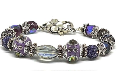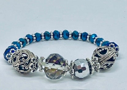Color Classics blue striking beads with crystals and silver spacers., this fits wrist size 6 inches. it is a stretch bracelet.