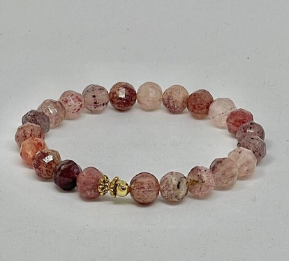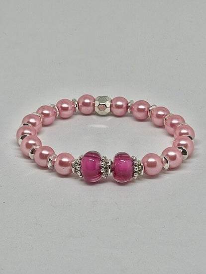 I DESIGNED THIS BEAUTIFUL SEMI PINK PEARL STRETCH BRACELET WITH STERLING SILVER AND TWO LAMP WORK FOCAL BEADS. FITS WRIST SIZE 6".7". MESSAGE ME FOR QUESTIONS.