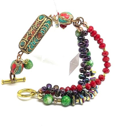 A DESIGN SHAPED BRACELET MADE WITH TILA BEADS. finished with a toggle clasp fits wrist size 6" to 6 1/2"