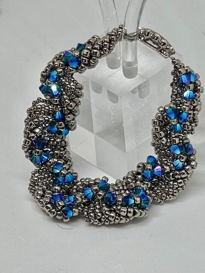 These are faceted cathedral beads, blue rondells and crystals finished with a sterling silver flower toggle clasp... fits wrist size 7...8 inches.