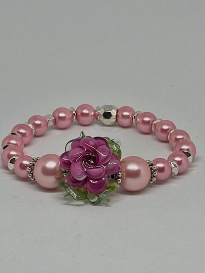 i designed this beautiful stretrch bracelet with 6mm pink fresh water pearls...semi pearls. with a beautiful Lamp Work flower bead and sterling silver spacers. fits wrist size 6..to7"