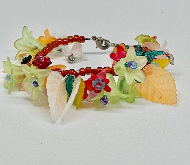 A beautiful bracelet designed with Lucite leaves and flowers also tiny seed beads. finished with an adjustable lobster clasp. Fits wrist size 7..8 inches.