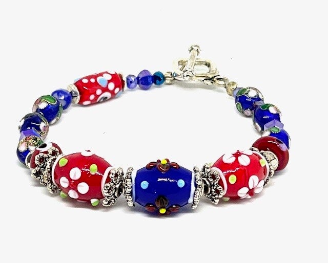 LAMP WORK BEADED BRACELET WITH STERLING SILVER CLASP FINISHED WITH SEVERAL CLOISONNE' BEADS. FITS WRIST SIZE 7.. 8"