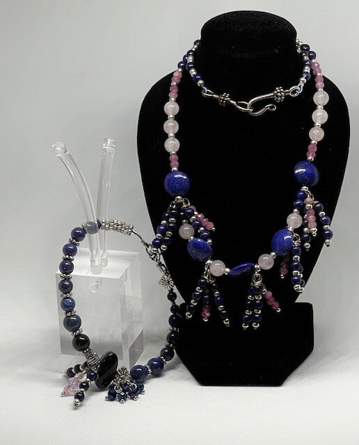 LAPIS LAZULI,ROSE QUARTZ & CLEART QUARTZ DANGLE NECKLACE WITH SERLING ADJUSTABLE HOOK CLASP. NECKLACE IS 18" LONG AND HAS MATCHING BRACELET ..FITS WRIST SIZE 7..8 INCHES.