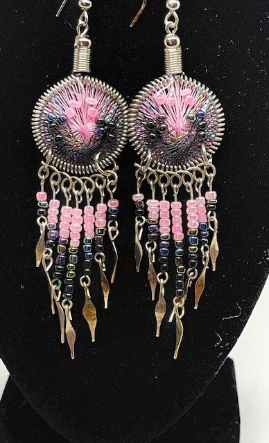 She is mostly pink ,adorned with tiny pink and multi- color beads weaved in with thread and silver spikes.