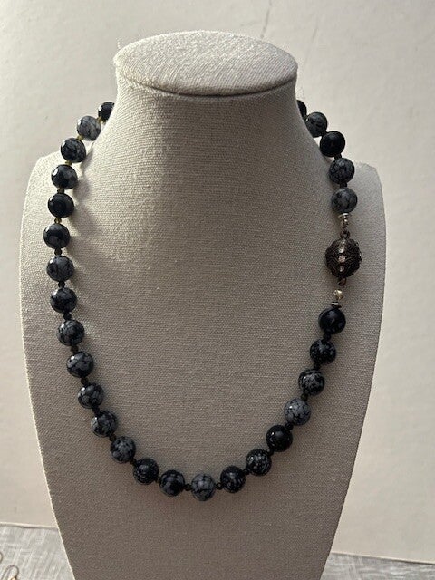 16MM FLOWER OBSIDIAN BEADS MIXED WITH 4MM OBSIDIAN BEADS . NECKLACE IS FINISHED WITH AN ANTIQUE MAGNETIC CLASP SHE IS 18" TALL .