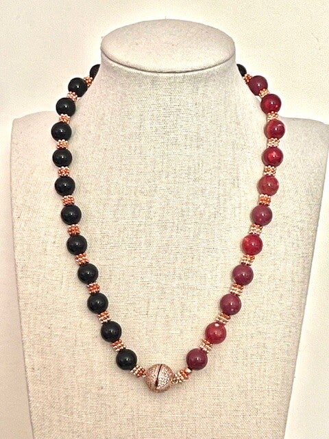 BEST OF BOTH WORLDS THIS NECKLAC. DESIGNED WITH OBSIDIAN PAIRED WITH CORAL BEADS HAS GOLD PLATED SPACERS AND A ONE OF A KIND MAGNETIC CLASP SHE IS 18" TALL