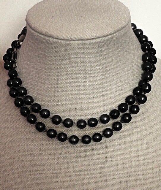 SHE IS A KNOTTED BLACK PEARL NECKLACE AND SHE IS 22" TALL