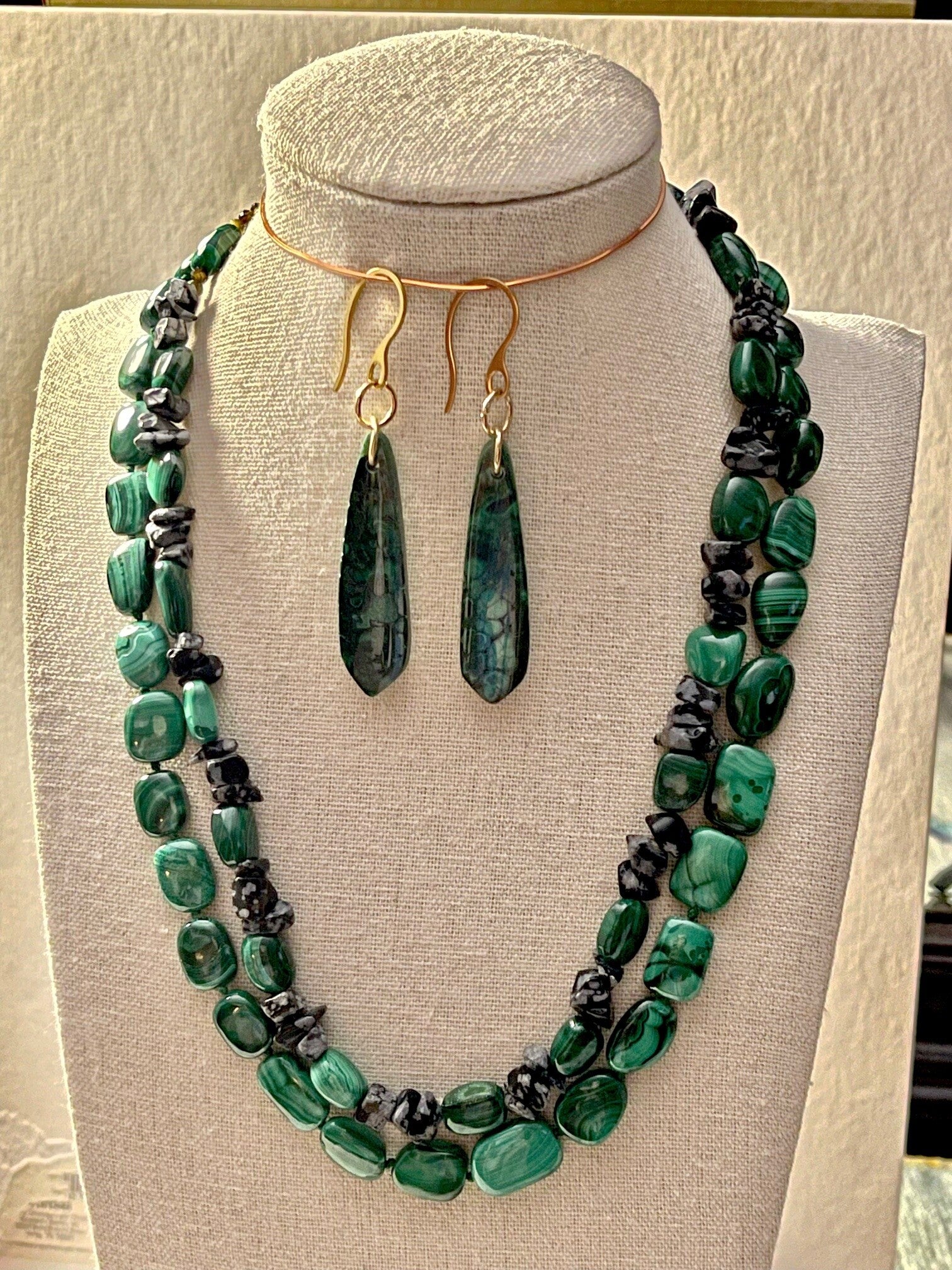 CREATE A LAYERED LOOK WITH THESE BEAUTIES. THE LONGER NECKLACE IS KNOTTED... MEANING THAT EACH BEAD HAS BEEN INDIVIDUALLY KNOTTED CREATING A UNIQUE SEPERATION BETWEEN EACH BEAD. THE SHORTER NECKLACE IS OBSIDIAN AND MALACHITE COMBINED. .. CHIPPED FLOWER OBSIDIAN. AND I DESIGN MATCHING MALACITE EARRINGS.
