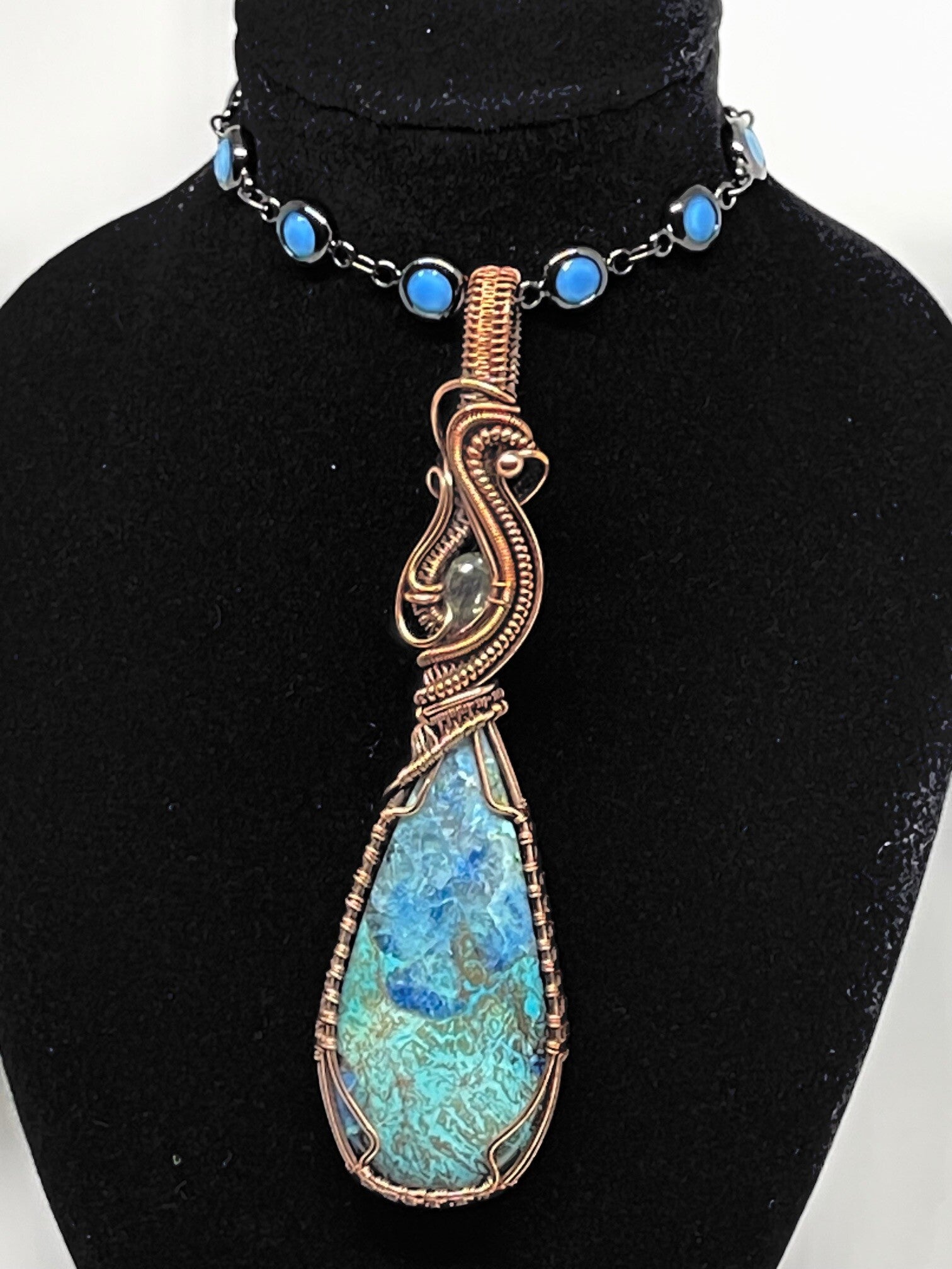 SHATTUKITE..THE NAME OF THI STONE. HAND WRAPPED IN COPPER. ACCENTED WITH A TINY GREEN OPAL. I EVEN ADDED A FANCY BEADED ENAMEL CHAIN.