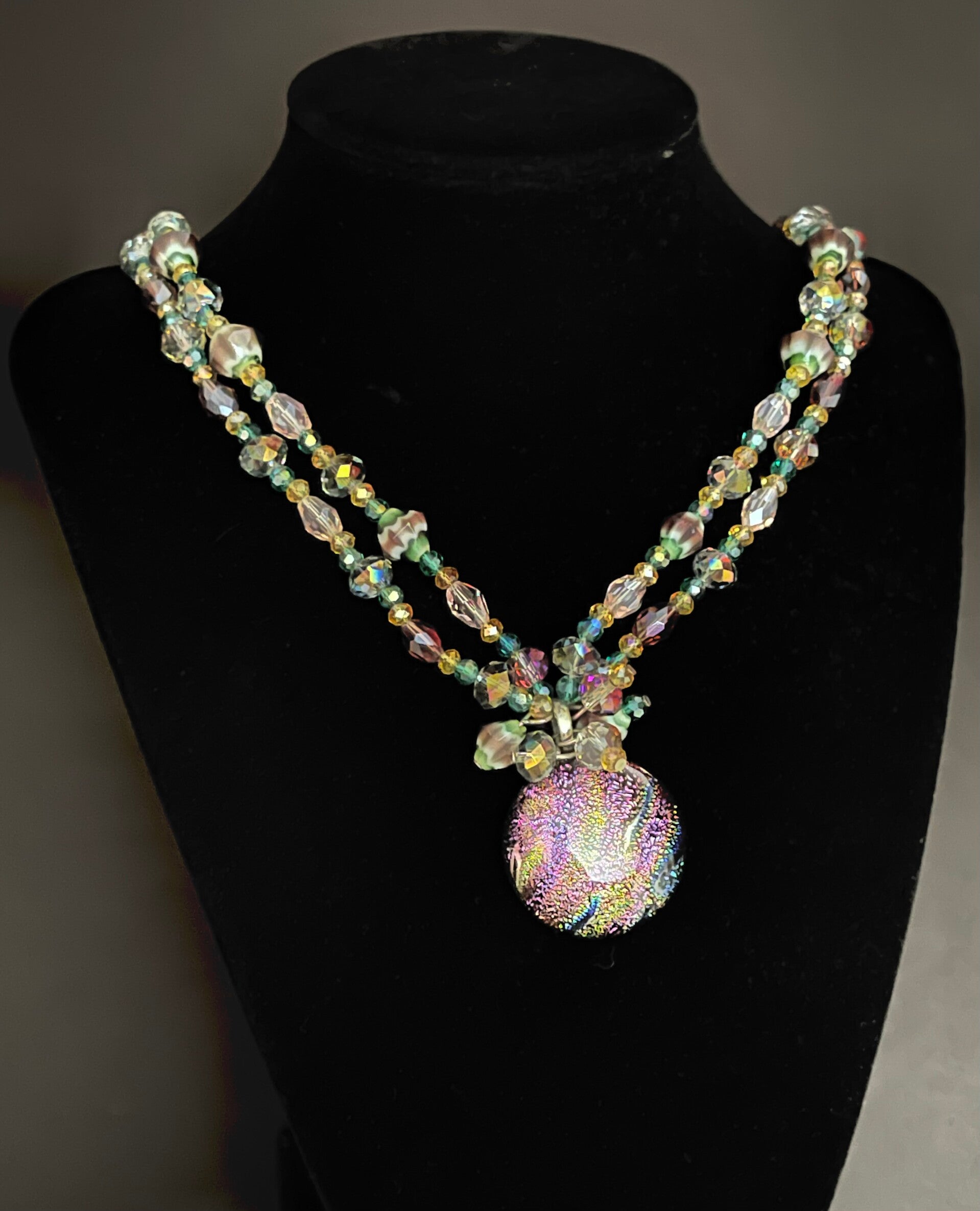DOUBLE STRAND 18" NECKLACE.. GLASS BEDS AND STERLING SILVER ADJUSTABLE CLASP. SHE HAS A LAPMWORK FOCAL PENDANT WITH BEADS ATTACHED.