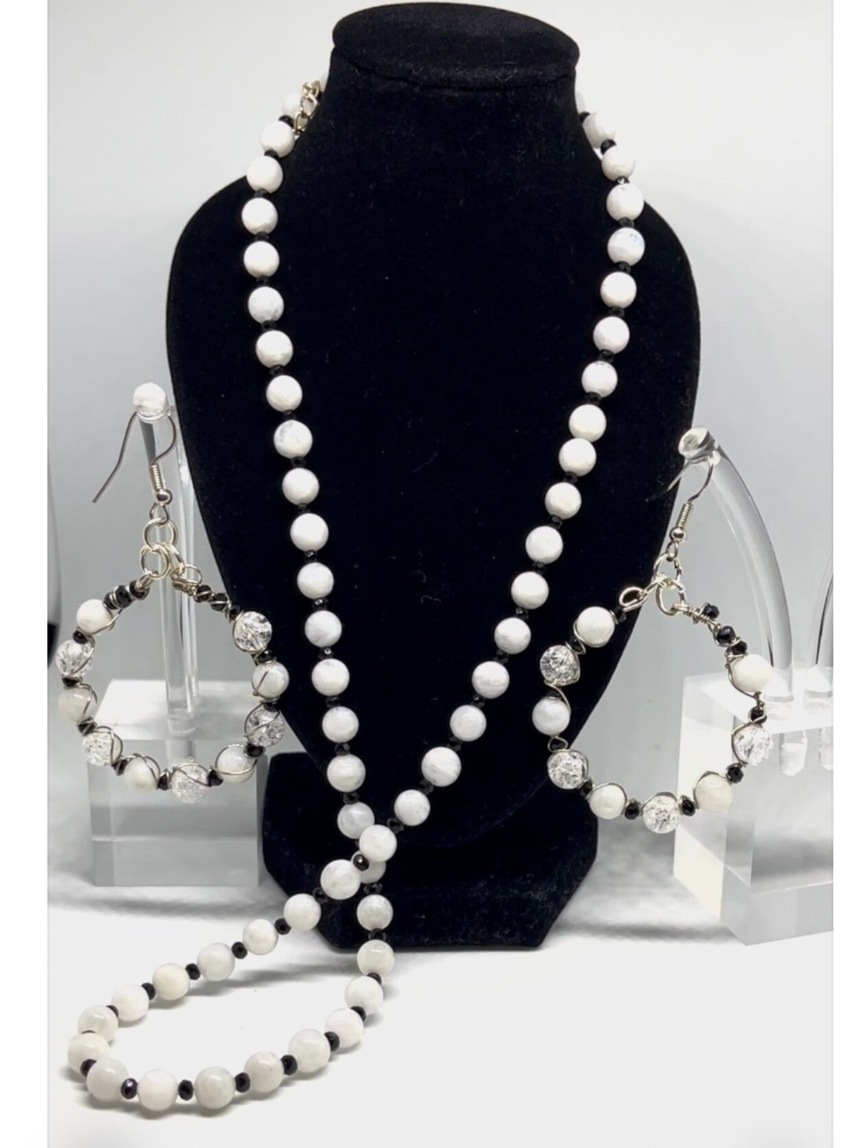 MOONSTONE AND BLACK SPINEL DESIGN NECKLACE WITH MATCHING HOOP EARRINGS. SHE IS 18" LONG ADJUSTABLE TO 22"