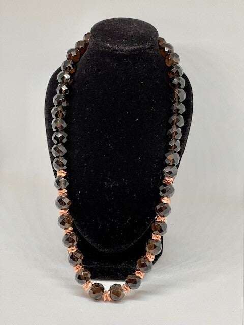 SMOKEY QUARTZ & ROSE GOLD . NECKLACE IS 16" IN LENGTH FINISHED WITH A ANTIQUE MAGNETIC CLASP.