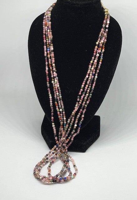 TINY TOURMALINE BEADS. NECKLACE IS DESIGNED WITH 4 STRANDS OF TINY 4MM TOURMALINE BEADS,FINISHED WITH A GOLD PLATED HOOK CLASP ..18" LONG