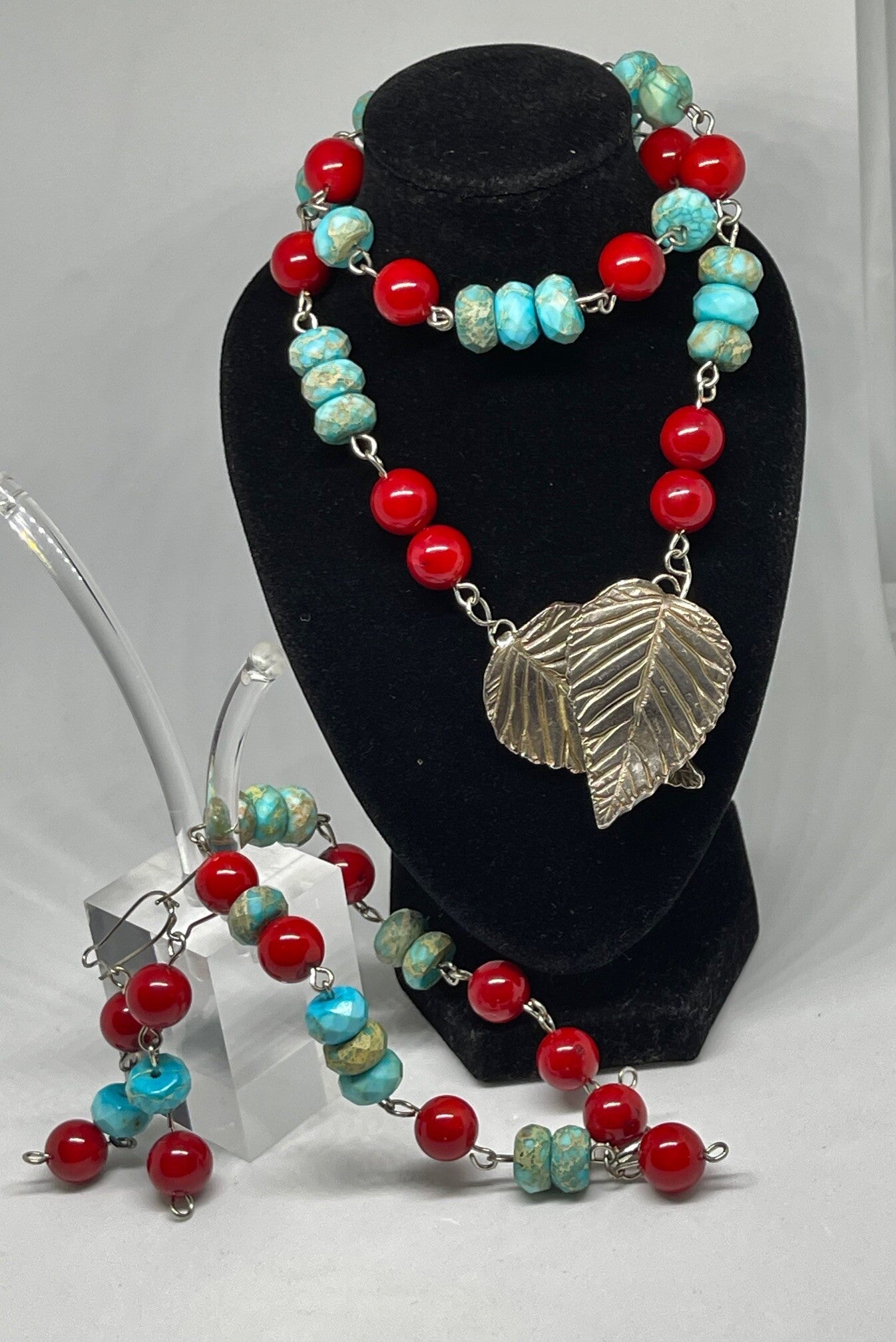 DESIGNED WITH A SOLID STERLING SILVER MAGNETIC LEAF CLASP.THIS NECKLACE IS A FRONT CLOSURE DESIGN WITH RED CORAL BEADS,FACETED TURQUOISE WITH CHAIN LINKS INDIVIDUALLY CRAFTED..MATCHING EARRINGS AND BRACELET WHICH FITS SIZE 6 1/2" TO 7.