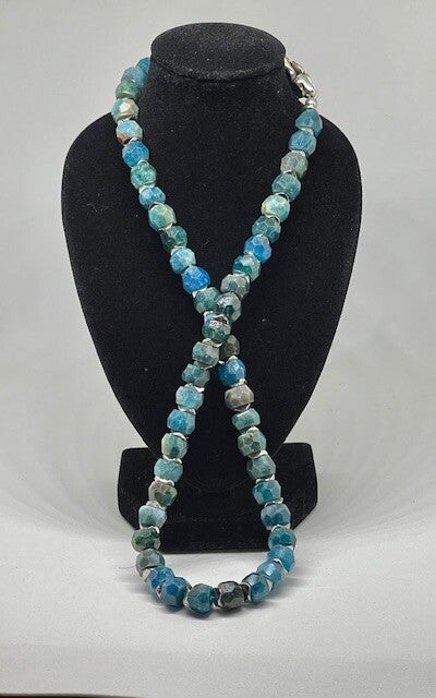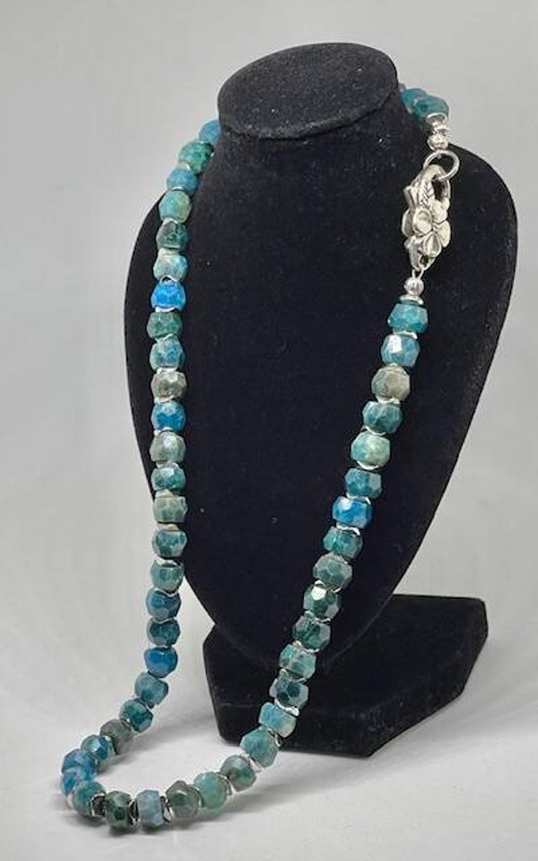 BLUE FACETED APATITE BEADED NECKLACE FINISHED WITH STERLING SILVER FLOWER CLASP. NECKLACE IS 16" IN LENGTH.