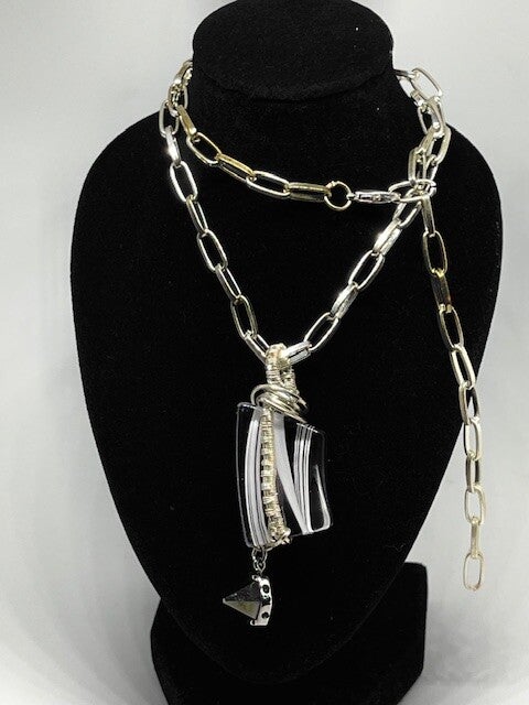 A SIMPLE HAND WRAP DESIGN WITH BLACK & WHITE GLASS BEAD AND STURDY CLIP CHAIN (SILVER PLATED) CHAIN IS 18" LONG