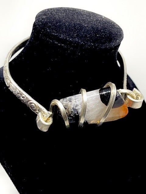 A CHUNKY DALMATION STONE BANGLE WITH STURY STERLING SILVER BAND TWISTED AROUN CREATINGTHIS ONE OF A KIND DESIGN BANGLE. SLIDE OVER YOUR WRIST.