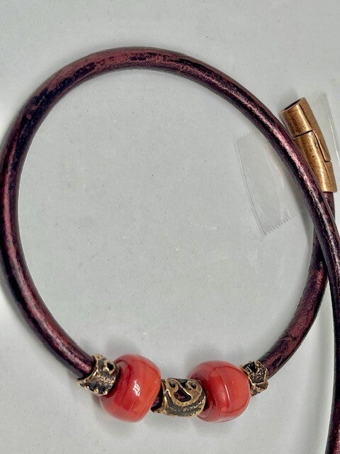 DESIGNED WITH LAMP WORK BEADS AND COPPER ACCENT. FINISHED WITH A COPPER MAGNETIC CLASP. WILL CUT LEATHER TO FIT YOUR WRIST SIZE ONCE ORDER IS RECEIVED.