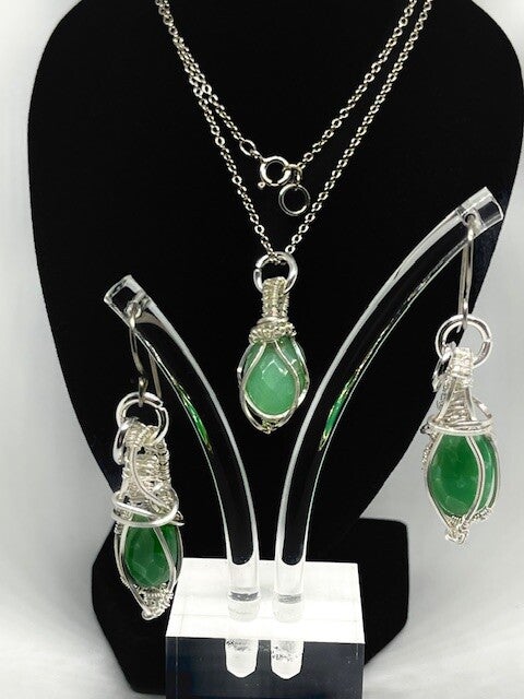THE STONE IS CHRYSOPRASE..SYMBOLIZE HAPPINESS,ENTERPRISE AND PRUDENCE. ITS A PWERFUL STONE THAT BRINGS GOOD FORTUNE & PROSPERITY. MATCHING EARRINGS ALL INTRICATELY HANDWRAPPED WITH FINE SILVER. STERLING SILVER.