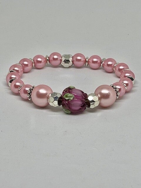 I DESIGNED THIS BRACELET WITH PINK SEMI PRECIOUS FRESH WATER PINK PEARLS.AND A FLOWER BUD LAMP WORK FOCAL BEAD FINISHED WITH STERLING SILVER SPAERS .