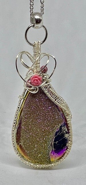 THE STONE IS A BLUE DRUZY. THE DRUZY IS IN THE SHINE OF THIS BEAUTIFUL PENDANT. DRUZIES ARE MEANT TO BRING HAPPINESS AND LAUGHTER TO YOUR DAILY LIFE. THIS LADY IS HANDWRAPED IN .925 STERLING SILVER DECORATED WITH A TINY PINK FLOWER AND TW 4MMM BEADS SHE IS 3 " TALL FROM YOUR CHAIN .. I HAVED ADDED A STERLING SILVER CHAIN WITH A MAGNETIC CLASP AND ALSO A LOBSTER CLASP. FOR YOUR CONVENIENCE.