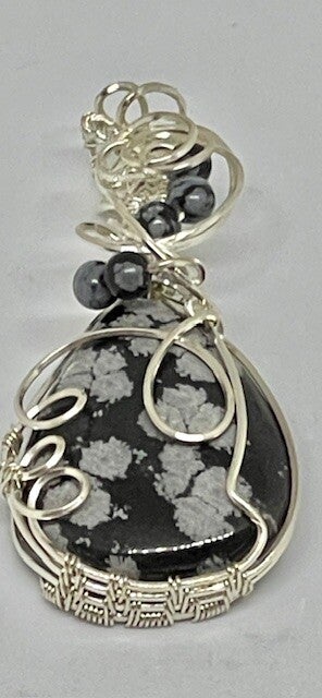 SNOWFLAKE OBSIDIAN HAND WRAPPEDIN .925 STERLING SILVER AND POLISHED..FINISHED WITH 6MM SNOWFLAKE OBSIDIAN BEADS...,., CARRY OBSIDIAN AND WEAR IT FOR WARDING OFF NEGATIVE ENERGY AND JEALOUSY.