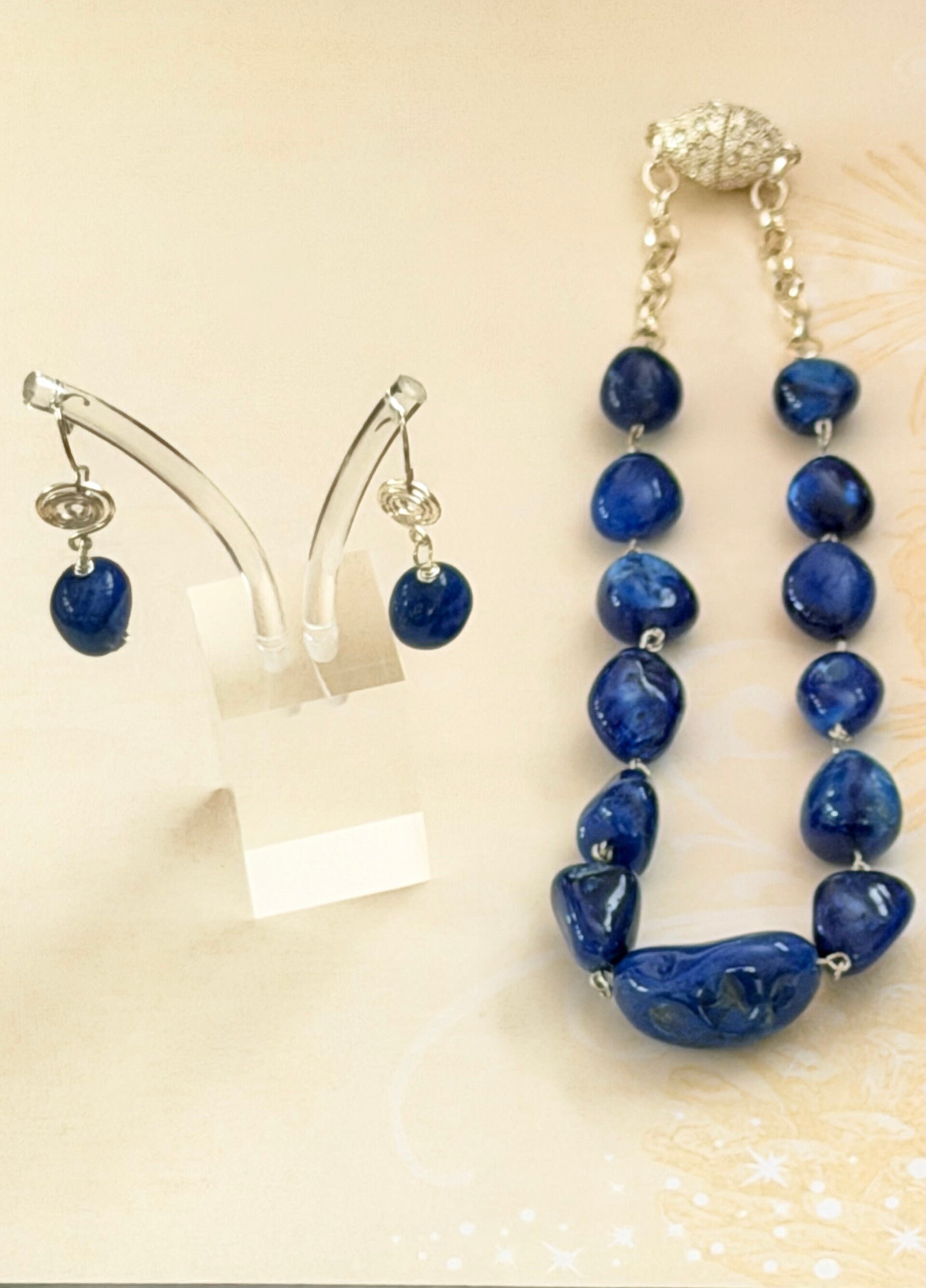 Chalcedony is a nurturing stone that promotes brotherhood and goodwill it observes negative energy. It brings the mind, body and emotions and spirit into harmony instill feelings of benevolence and generosity. These are sea blue Chalcedony beads individually linked with sterling silver chain links, and a sterling silver rhinestone magnetic glass the length is 18 inches.Has matching sterling silver swirl earrings