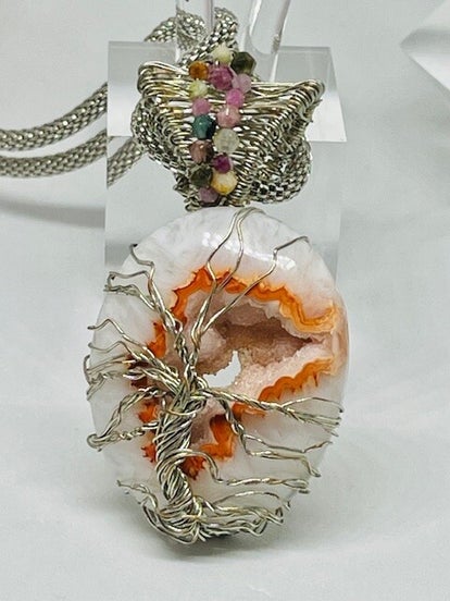 Agate Druzy Tree of Life pendant.. the tree is made with .925 sterling silver. I added several faceted tourmaline beads.The chain is a 16" adjustable silver silk chin.. very flexible.Agate carries the vibratiion of all living things...connected to Mother earth.. This beauty is 2 1/4" in length.