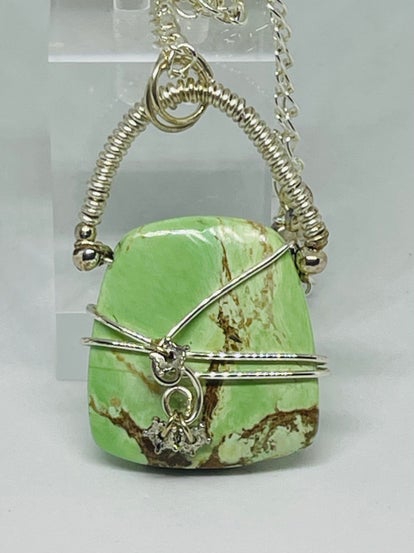 THE STONE IS CHRYSOPRASE..SYMBOLIZE HAPPINESS,ENTERPRISE AND PRUDENCE. ITS A PWERFUL STONE THAT BRINGS GOOD FORTUNE & PROSPERITY. MATCHING EARRINGS ALL INTRICATELY HANDWRAPPED WITH FINE SILVER. STERLING SILVER.