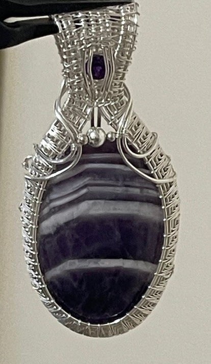 SHE IS A BEAUTIFIUL SOLID OVAL AMETHYST DELICATELY HAND WRAPPED IN .925 STERLING SILVER. I ADDED A TINY FLAT BACK AMETHYST STONE AND A SILVER 3MM BEAD. SHE IS 3" TALL. HER MEANING IS HOME,MEDTATION,BUBBLE OF LIGHT,TEACHERS,TRUCK DIVERS, WEARING EMETHYST BRINGS BALANCE AND WELLNESS. ALSO AQUARIUS BIRTHSTONE. THIS IS A SOLID SOLID AS A ROCK PIECE .A STATEMENT PIECE. THERE IS A MATCHING NECKLACE BRACELET AND EARRINGS. LISTED IN THE NECKLACE SECTION ON HERE.