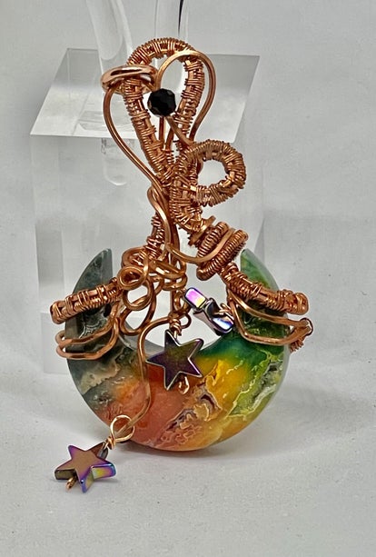 TINY MOON STONE HAND WRAPPED. TINY TREE DESIGN SHE IS 3/4" WIDE AND HANGS ONE INCH FROM YOUR CHAIN. BEAUTIFUL WORK OF ART. WEARABLE ART FOR ANY AND EVERYONE. FEATURES A WRAPPED BAIL AND SWIRLS. A SILVER CHAIN IS AVAILABLE AT $10.00
