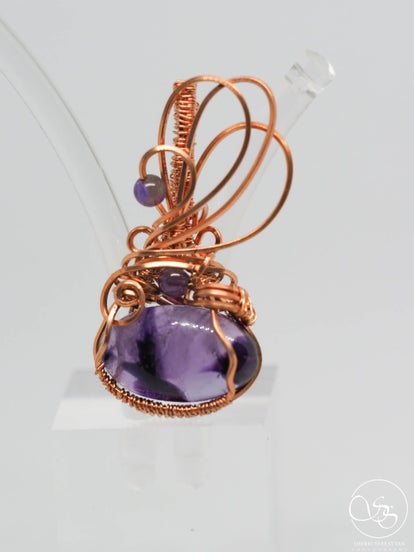SHE HAS EYES AND SHE CAN FLY. THIS AMETHYST STONE HAS BEEN HANDWRAPPED IN 14CWT GOLD FILLED WIRE .. I ADDED TWO AMETHYSE 6MM BEAD FOR ACCENT. THIS STONE MEASURES 2 1/2" FROM YOUR CHAIN. ANOTHER FAVORITE .. AMETHYST.. PEACE,LOVE AND LIGHT.